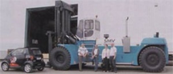 Ihren bisher größten Frontstapler hat die SMV Stapler-Maschinen-Vertrieb-GmbH ausgeliefert. Der SL 52-1200 A hebt 52 t bei 1.200 mm LSP, ist 56.400 kg schwer, hat 6.000 mm Radstand und ist 10,8 m lang. Der Stapler, der zu den größten Geräten seiner Spezies in Deutschland zählt, ist mit Sonderausstattungen wie Gabel-Schnellwechseleinrichtung, Rückfahrkamera und Zentralschmieranlage ausgerüstet. Er schlägt seit Juli in einem Stahlwerk mit 6.500 mm langen Bofors-Supergabeln große Verbindungsstücke und Flansche um.